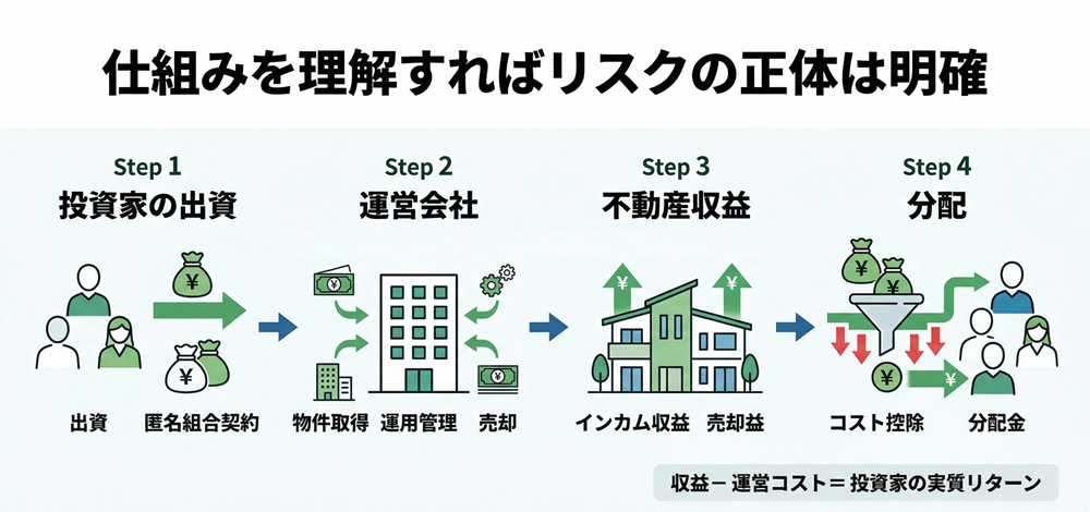 投資家は匿名組合契約を通じて出資し、運営会社が物件の取得や管理、売却までを一括して担います。