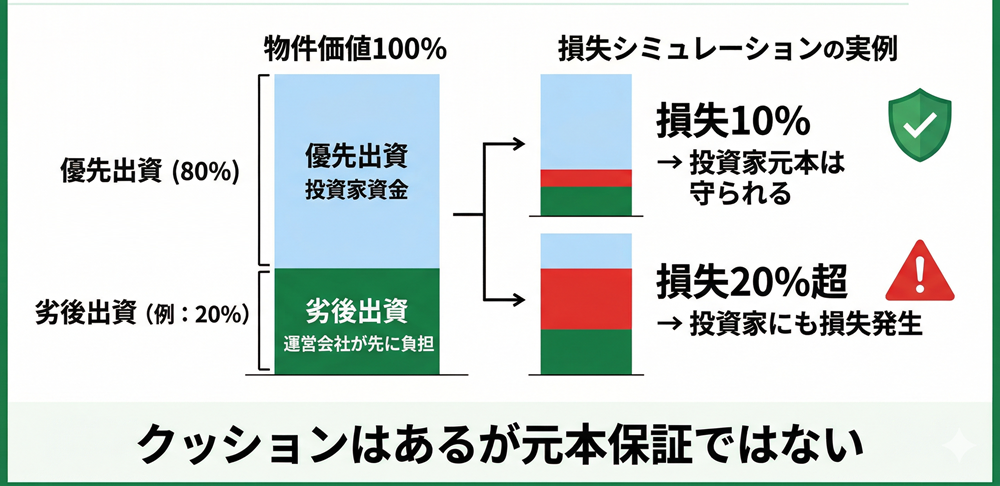 運営会社が10%分を負担する設計であれば、10%までは投資家の元本は守られるものの、10%を超える下落では投資家側が損失を負担。